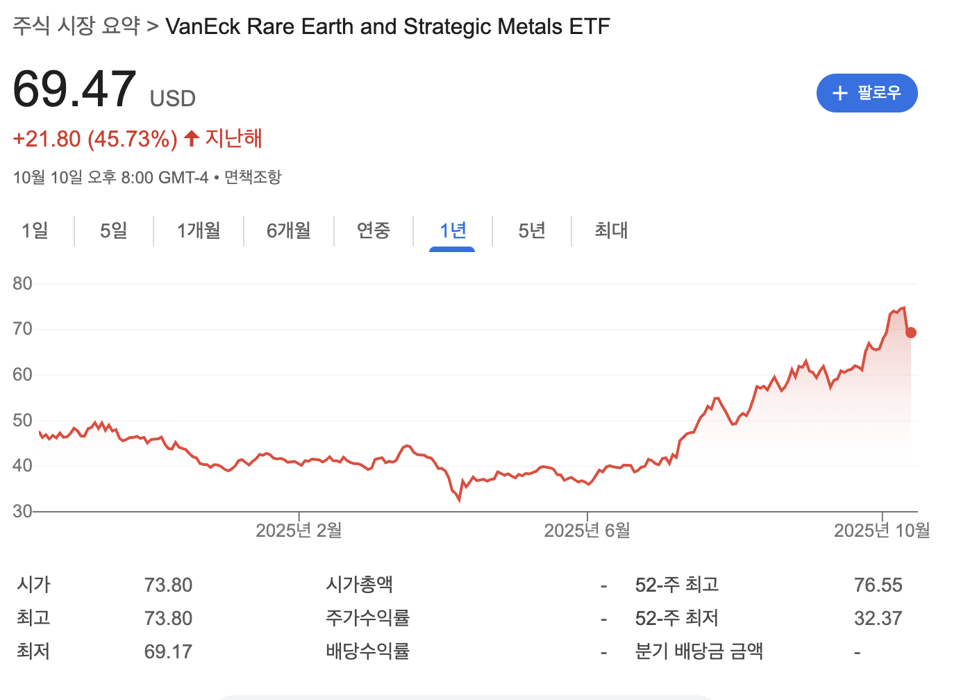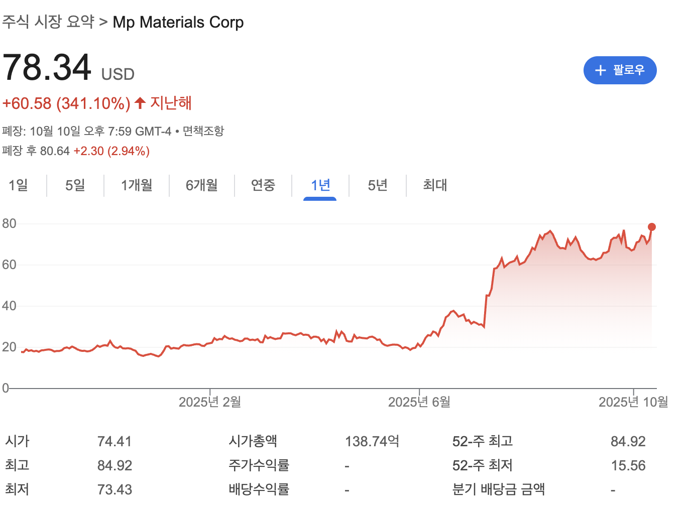 2025년 10월 기준, MP Materials 주가는 $78로 지난 1년간 350% 급등했어요! 6개월만 봐도 180% 이상 올랐죠. 😱