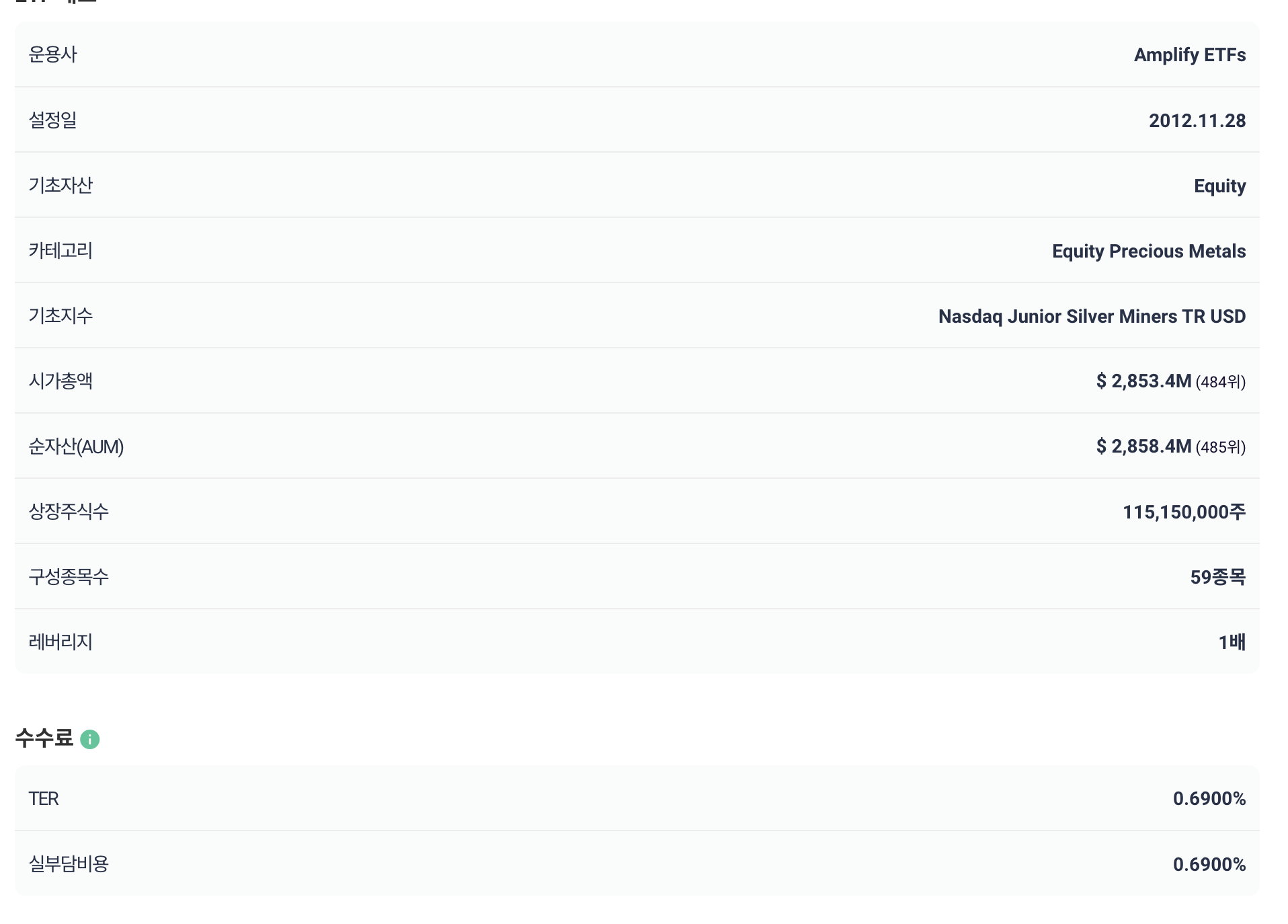 SILJ는 Amplify Junior Silver Miners ETF의 약자예요. 쉽게 말하면 은을 캐는 중소형 광산 회사들에 투자하는 상품이죠. 은을 직접 사는 게 아니라 은을 캐는 회사의 주식을 모아놓은 바구니라고 생각하시면 돼요!
