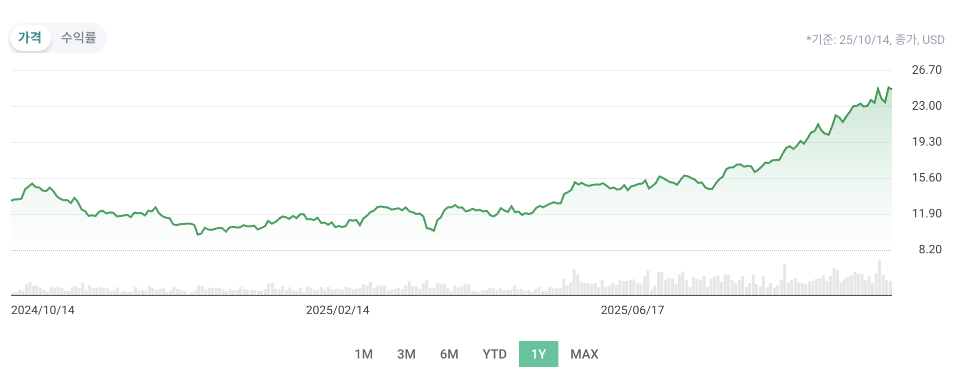 작년 말 $9.72였던 가격이 지금 $24.78이니까, 1년도 안 돼서 2.5배 넘게 올랐다는 거예요! 😱 마치 롤러코스터를 타는 것처럼 짜릿한 상승세죠?